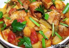 Нарезать брусочками мясо, обжарить на сильно разогретом растительном масле. Добавить пассерованную томатную пасту, залить водой и тушить почти до готов-
